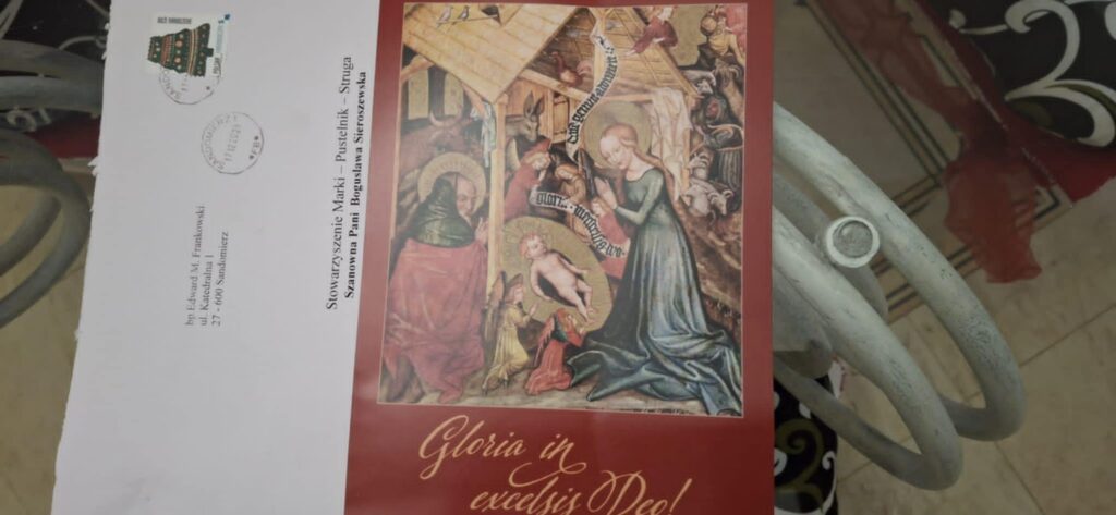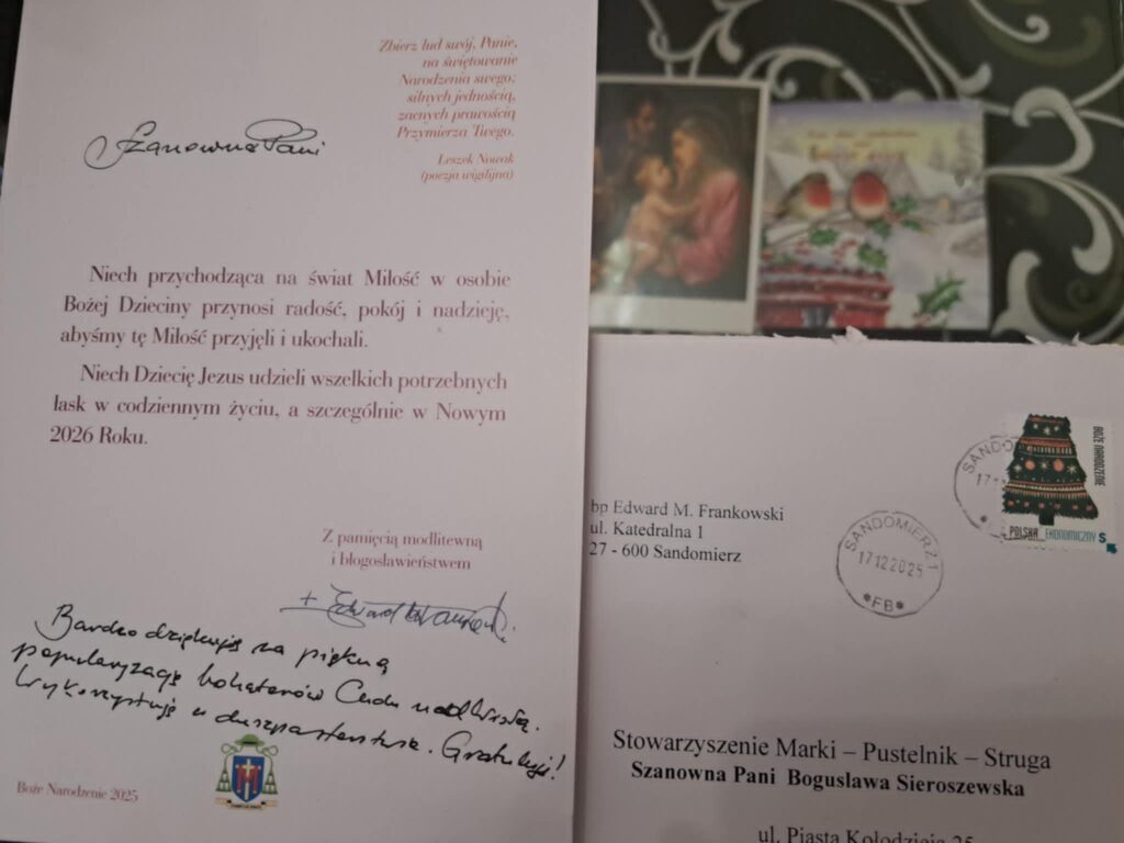 Życzenia świąteczno-noworoczne od Pasterza Sandomierskiego Księdza Biskupa Edwarda Frankowskiego dla Stowarzyszenia Marki-Pustelnik-Struga z podziękowaniem za piękną popularyzację bohaterów Cudu nad Wisłą w publikacji „W Pałacyku po Bitwie” autorstwa Bogusławy Sieroszewskiej.