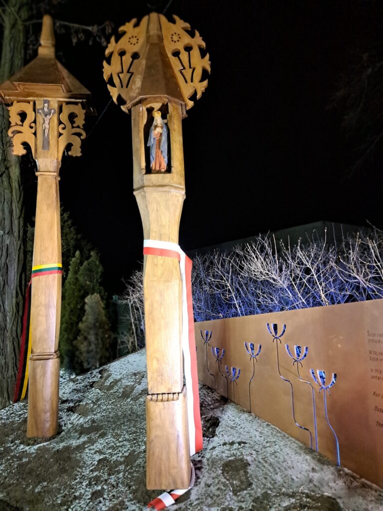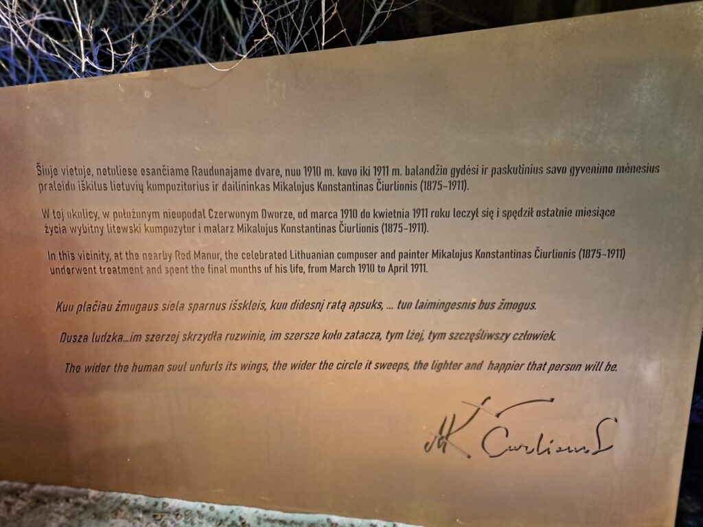 Tablica pamiątkowa, kapliczka przydrożna i kapliczka cmentarna na rogu ulic Kasztanowej i Norwida w Markach-Pustelniku odsłonięte przez prezydentów Polski Karola Nawrockiego i Prezydenta Litwy – 24 stycznia 2026 roku, na zakończenie 2025 Roku Mikołaja Konstantego Ciurlionisa. Cytat z tablicy – memoriału: DUSZA LUDZKA… IM SZERZEJ SKRZYDŁA ROZWINIE, IM SZERSZE KOŁO ZATACZA, TYM LŻEJ, TYM SZCZĘŚLIWSZY CZŁOWIEK. fot. Bogusława Sieroszewska