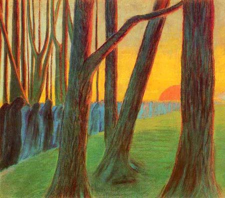 Lasek sosnowy i ogród wokół Czerwonego Dworu w Markach- Pustelniku nawiązuje do obrazu Czurlanisa z cyklu Symfonii Pogrzebowej z 1903 roku, z powtarzającym się motywem sznurem maszerujących żałobników (poniżej).
