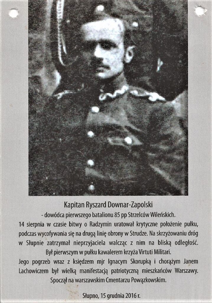Państwo Polskie upomniało się o Bohatera kpt. Ryszarda Downar-Zapolskiego, Kawalera Virtuti Militari, który poległ w wieku 27 lat, od śmiertelnych ciosów zadanych przez bolszewików na krzyżówkach w Słupnie, obrzeżach Radzymina, nieopodal Góry św. Antoniego w Markach-Strudze, ostatecznie odbijając miasto z rąk bolszewików.