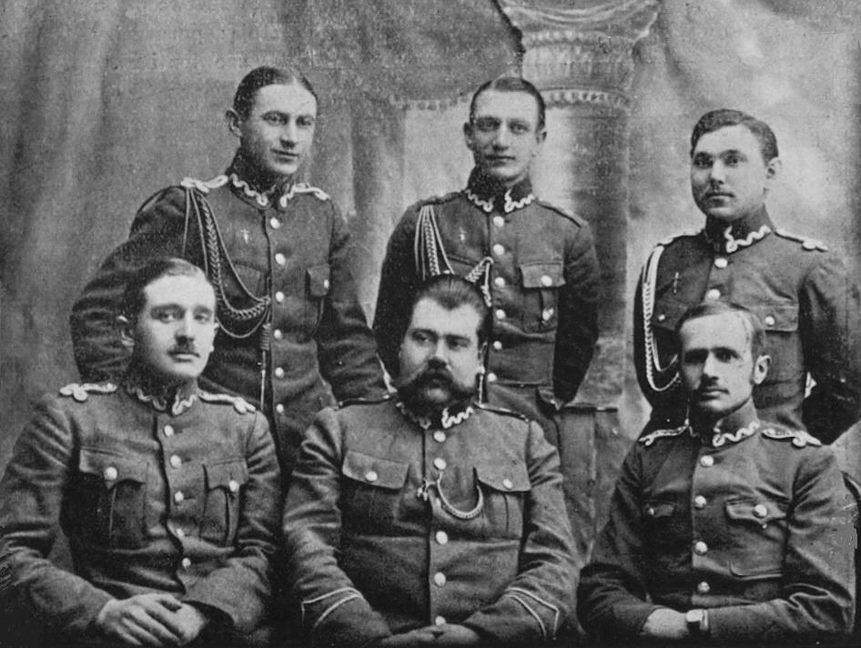 Wojsko Polskie – 85.Pułku Piechoty Strzelców Wileńskich przed Bitwą Warszawską 1920 roku, kpt. Ryszard Downar-Zapolski siedzi pierwszy z prawej, dowódca pułku piechoty, mjr Stanisław Bobiatyński siedzi obok, po środku.