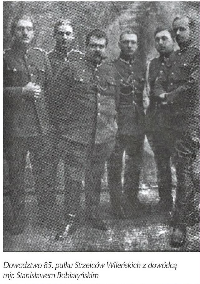 Wojsko Polskie – 85.Pułku Piechoty Strzelców Wileńskich przed Bitwą Warszawską 1920 roku, kpt. Ryszard Downar-Zapolski siedzi pierwszy z prawej, dowódca pułku piechoty, mjr Stanisław Bobiatyński siedzi obok, po środku.